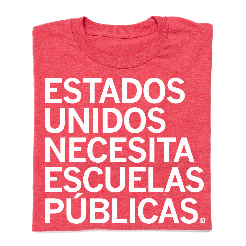 Estados Unidos Necesita Escuelas Públicas. A Portion of All RAYGUN Sales Raise Money For Organizations That We Support. White Screen Print on a Heather Red T-shirt (50% Combed Ringspun Cotton / 50% Polyester). Cut and sewn sweatshop free. Designed and printed by Union Labor at RAYGUN.